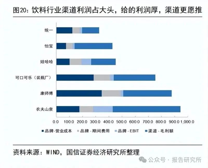 2014-2019 年:消费升级背景下的品牌为王时代,农夫华润主导行业升级:2008 年四万亿刺激带动居民消费力提升,白酒、啤酒、乳制品等大部分食饮子品类开启结构升级,农夫和华润在 2010 年 PET 成本压力下顺势提价,一元水售价提至二元水,率先引领行业升级,百岁山(定位水中贵族)、依云巴黎水等三元及以上价格带产品亦高增。具体看一元水往二元水的成功升级:①高渠道利润解决了谁卖的问题:软饮料行业“得渠道者得天下”,二元水对比一元水,在运费、陈列面等运营成本不变的情况下,多给经销商和终端店主 50%以上的毛利额,渠道推力充足,终端能见度大幅提升。②高品牌认知解决了谁买的问题:2013 年起连续报道十余起大型自来水异味事件,同时“概念水”风靡,行业竞争混乱。2014 年包装水国标出台,规定包装饮用水名称应当真实、科学,不得以水以外的一种或若干种成分来命名。众多小厂被收割,同时可乐冰露/康师傅(康师傅矿泉水改为优悦饮用水)换标过程中被竞品分流。提价后厂商也有更多空间费投,典型是怡宝自2011年后加大体育营销和品牌声量,绑定国家队为其品质背书,而“农夫山泉有点甜、我们不生产水,我们只是大自然的搬运工”则延续营销上的稳定发挥。