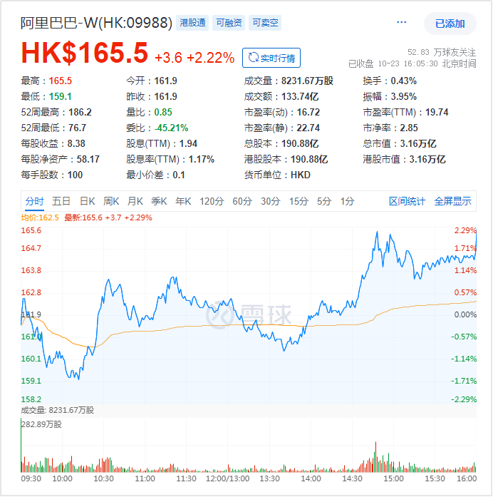 或受利好消息影响。截至10月23日,阿里巴巴港股报收165.5港元/股,涨2.22%,市值3.16万亿港元。