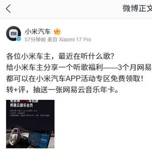 小米汽车:所有已提车车主可免费领取 3 个月网易云音乐车机版会员