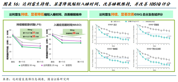 (1)疗效:达利雷生可持续、显著降低缩短入睡时间、改善睡眠维持