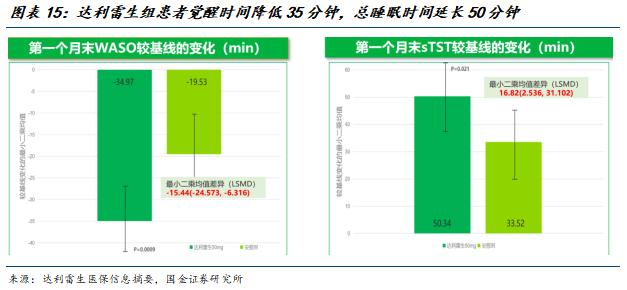 中国人群关键3期临床1(SIM0808-301研究):随机,双盲,安慰剂对照,多中心研究.主要研究终点:第1个月末入睡后觉醒时间(WASO)较基线的变化,关键次要研究终点:第1个月末总睡眠时间(sTST)较基线的变化。达利雷生组患者觉醒时间降低35分钟,较安慰剂改善15分钟;总睡眠时间延长50分钟,较安慰剂延长17分钟。