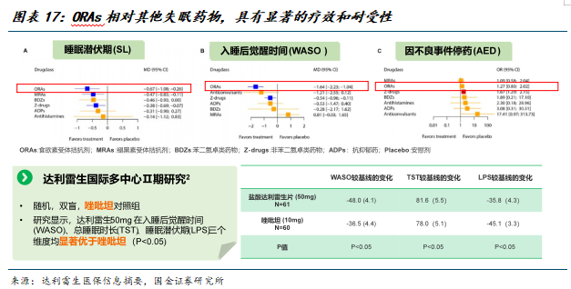 荟萃研究:一项包括20种失眠药物的研究显示,食欲素受体拮抗剂类药物(ORAs)相对其他失眠药物,具有显著的疗效和耐受性。达利雷生国际多中心Ⅱ期研究(一项随机,双盲,唑吡坦对照组研究)显示,达利雷生50mg在入睡后觉醒时间(WASO)、总睡眠时长(TST)、睡眠潜伏期(LPS)三个维度均显著优于唑吡坦(P<0.05)。