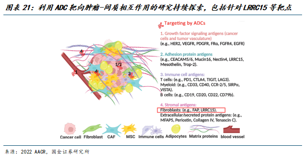 丰富的纤维化间质是大多数实体瘤的典型特征,间质激活会促进癌细胞的癌变、治疗抵抗和转移扩散。因此,近年来,将肿瘤间质靶向治疗与标准治疗相结合已成为一种极具潜力的治疗策略。富含亮氨酸重复序列蛋白15(LRRC15)参与细胞间及细胞与基质的相互作用,因其在间充质来源肿瘤(如肉瘤、胶质母细胞瘤、黑色素瘤)以及乳腺、头颈部、肺和胰腺肿瘤微环境中的癌相关成纤维细胞中高表达,而成为极具前景的抗癌靶点。利用特异性ADC有效靶向LRRC15,有望改善LRRC15阳性(LRRC15⁺)间充质来源癌症或间质促结缔组织增生性癌症患者的预后。