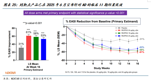 同靶点药物Rezpeg在2025年6月宣布针对AD的II期临床呈现积极结果。Rezpeg是一种靶向IL-2受体复合物的药物,旨在刺激调节性T细胞(Treg)的生长,从而抑制导致特应性皮炎症状的过度活跃的免疫反应。REZOLVE-AD研究共纳入393名中重度特应性皮炎患者,设定了三个基于体重的皮下注射剂量组(18µg/kgQ2W,24µg/kgQ2W、24µg/kgQ4W)、一个每两周一次的安慰剂组,随机分配后治疗16周。结果显示,16周时,rezpeg各治疗组EASI评分下降53%-61%,其中最高剂量组(24µg/kgQ2W)效果最佳,而安慰剂组仅下降31%。在关键次要终点上,34%-46%的患者实现EASI-75,高剂量组中更有25%的患者达成EASI-90;同时,高剂量组在改善瘙痒症状方面优势显著,42%的患者瘙痒程度明显减轻。安全性数据与既往研究一致,在疗效和安全性上该靶点均得以印证。