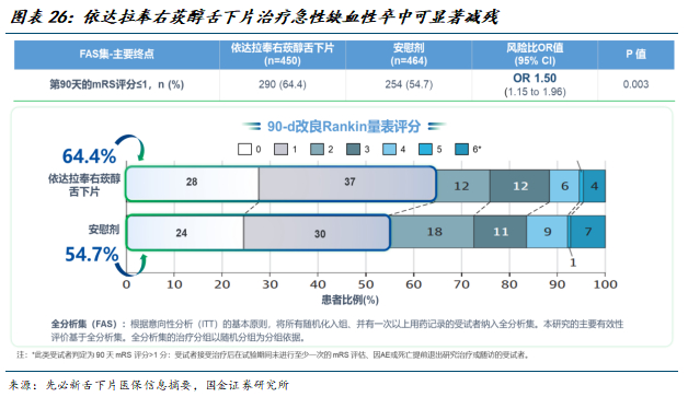 先必新舌下片获批上市,联合注射液构筑序贯疗法。先必新舌下片于2024年12月获批上市。舌下片可在溶/取栓前使用,崩解吸收速度快,血药浓度给药后迅速达峰,且与注射液AUC暴露相似,更早的对患者脑细胞进行保护,获益更大。且相较于静脉滴注,无需特定的医疗环境和设备,有助于在急性期尽早治疗缺血性卒中、降低重症化风险,改善神经功能预后。舌下片中国Ⅲ期临床研究TASTE-SL发表于《JAMANeurology》,结果先必新舌下片治疗急性缺血性卒中,可显著减残:第90天mRS≤1分比例达到64.4%,组间差异9.7%。先必新注射液+舌下片组合的序贯疗法,有助于延长DOT,并使得患者获益最大化。此外舌下片还在拓展卒中后认知障碍适应症,有望带来新增量。