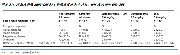 目前在研管线多处临床前阶段,AbbVie的同靶点药物ABBV-085展现出初步有效性。目前全球有多款管线在研,但基本处于临床前阶段,仅abbvie的ABBV-085(Samrotamab vedotin)处于临床I期。ABBV-085此前已披露有效性数据:①临床前研究:ABBV-085能够在体外系统中杀死LRRC15阳性癌细胞,并在代表不同LRRC15阳性实体瘤适应症的多种实体瘤模型中展现出体内疗效,在表达LRRC15的软组织肉瘤(STS)和骨肉瘤患者来源的异种移植瘤模型中具有显著的抗肿瘤活性,在小鼠模型中,联用吉西他滨或抗PD-1抗体均显著提高了ABBV-085的抗肿瘤活性;②一项85例患者的I期临床:接受3.6mg/kg剂量治疗的骨肉瘤或UPS患者中,ORR为20%,其中4例患者达到确认的PR,另有2例UPS患者达到未确认的PR,在确认PR的患者中,m-DOR为8个月。(在局部晚期或转移性肉瘤的治疗中,化疗单药治疗的有效率仅为:多柔比星12%,异环磷酰胺6%-8%)。