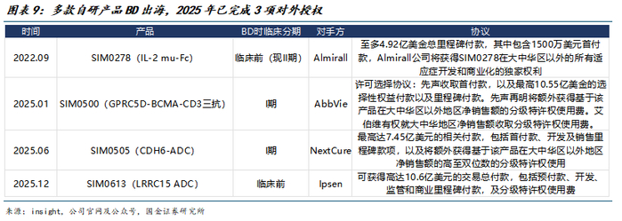2025年12月,公司与法国益普生针对SIM0613(LRRC 15 ADC)达成独家许可协议,法国益普生获得SIM0613大中华区以外的全球独家开发、生产和商业化权益。公司有望获得最高10.6亿美元的总交易付款,包括4500万美元首付款,以及研发、监管和商业化里程碑付款,此外,还可获得分级特许权使用费。