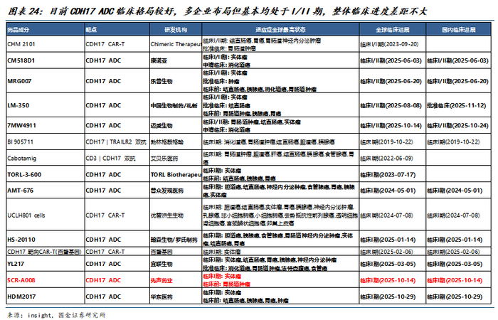 目前尚无产品上市,在研管线多处早期,临床竞争格局相对较好。目前CDH17 ADC共有10家企业已进入临床阶段,均处于I期或I/II期阶段,其中8家均为25年内进入I期临床,临床整体差距不大。目前SIM0609已于2025年9月获批CDE的IND批件,并于10月进入I期临床。