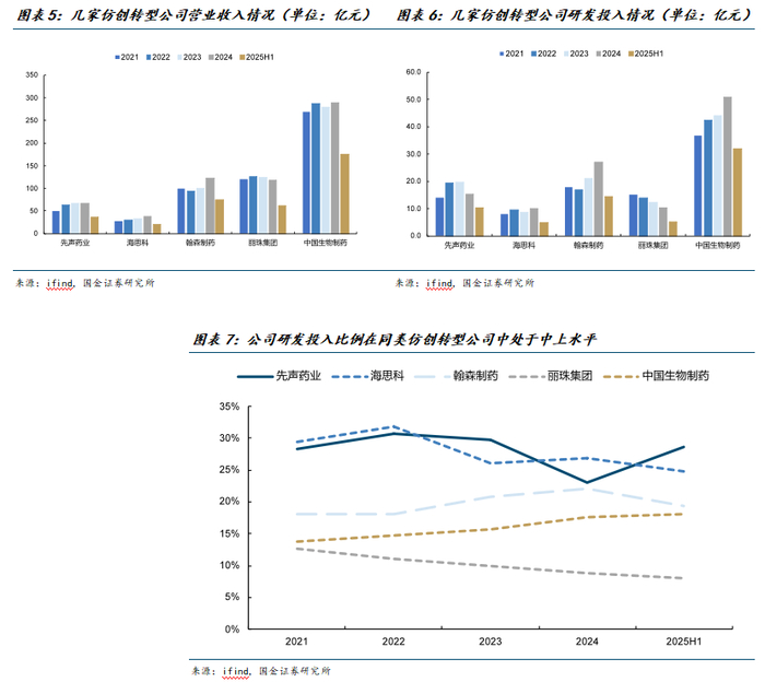 2020年以后快速推进的创新转型阶段。2020年之后,公司进入创新转型快车道。公司一方面持续加码研发投入,自研持续推出新管线,2020-2024年5年间累计研发投入超68亿元,占营收比例均超20%;另一方面采用BD引进的高效模式扩充创新管线,既自主攻关核心技术,也通过合作引进潜力品种,如快速推进引进的CDK4/6靶点药物科赛拉、失眠药物科唯可等上市。这一阶段多款重磅创新药密集获批,如2020年卒中治疗领域创新药先必新、2022年全系骨髓保护创新药科赛拉、2023年国产首款3CL抗新冠创新药先诺欣等先后落地。