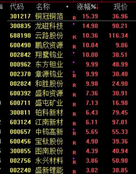 有色板块延续涨势,翔鹭钨业、章源钨业等涨停。