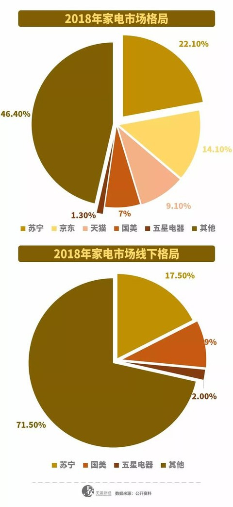 根据《2018年中国家电行业年度报告》显示,京东占2018年中国家电市场全渠道的14.1%,五星电器则仅占1.3%,与苏宁22.1%的份额相比仍有较大的差距。另外,五星电器在线下市场也仅占2%。