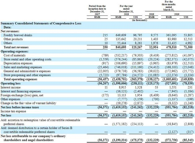 招股书显示,2019年1季度,瑞幸咖啡的营收为4.79亿元,同比增35.94%,净亏损5.52亿元,较去年同期亏损扩大了4.20亿元;2018年全年,瑞幸咖啡的营收为8.41亿元,净亏损16.19亿元,归属于公司股东及天使投资人的净亏损达31.90亿元。