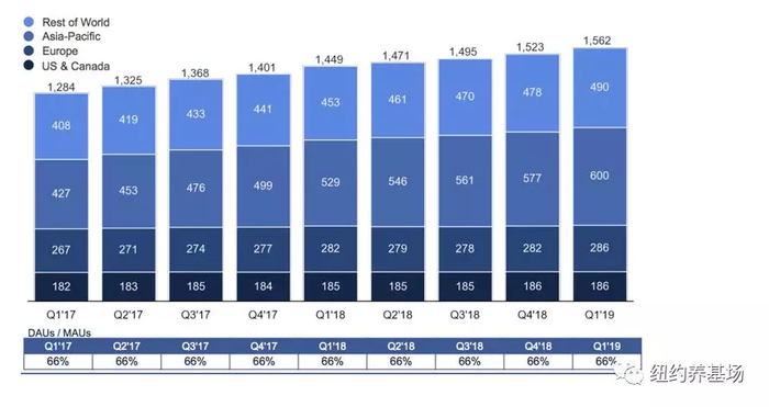 分区来看,北美地区用户环比小幅提升;欧洲地区用户数继续回涨,增速放缓;亚太和其他地区继续保持对Facebook用户增长的主要贡献。日活跃用户数达到15.62亿(同比+7.8%,环比+2.6%)。