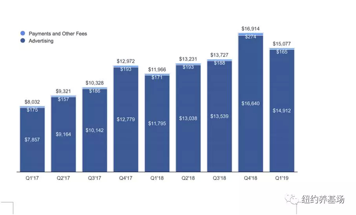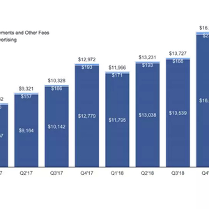 具体来看:2019年Q1广告收入为149.12亿美元(同比+26%,环比-10%),占营收比例达98.9%。其中,移动广告营收约占整个季度广告营收的93%,去年同期这一比例为91%。
