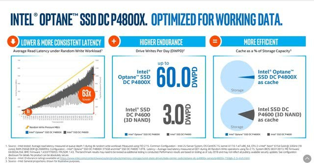 而在擦写寿命和IO抖动上,在笔者某次采访上,英特尔拿其企业级傲腾SSDP4800X与普通NAND SSD做了对此,据英特尔介绍,P4800X在DWPD上达到60次,而我们也知道,普通NAND SSD的DWPD通常为3次。同时,随着写压力增长,P4800X的延时几乎无变化,同时非常稳定。