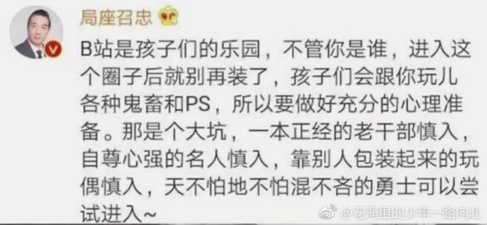 在几年前的B站,张召忠是“忽悠”,是“鬼畜全明星之一”,面对B站鬼畜视频这种解构权力的行为,张召忠干脆放下架子,放下所象征的“权力”,平等地与孩子们对话。不管别人怎么说,他从没生过气,最后干脆自己把“局座”这个头衔给自己安上了。