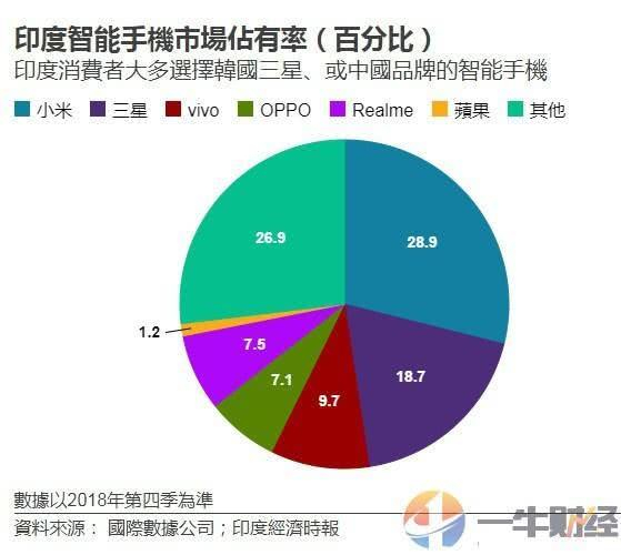 如一牛财经此前《郭台铭表态!富士康将苹果生产转移到印度!这对中国制造意味什么? 》文中就提到过,富士康转移到印度生产iPhone后,必然会扩大其在印度市场的占比,而目前苹果手机在印度市场占有率还不够,如下图所示: