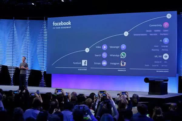 马克·扎克伯格在2016年的一次Facebook大会上介绍该公司的十年路线图。