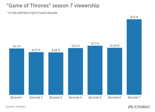 相比之下,2017年7月《权力的游戏》第七季开播当晚就吸引了1010万观众收看。在第二和第三周,《权力的游戏》最新一集的首播收视人数略有下降,但在第七季的每个首播之夜,观众对该剧的兴趣持续升温。
