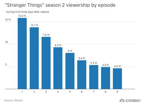 尼尔森公司负责产品领导的高级副总裁Brian Fuhrer上周在公司的前期发布会上表示,《怪奇物事》第二季于2017年10月首播,当天就有900万观众收看,是过去一年半以来Netflix原创剧集收视人数的两倍。