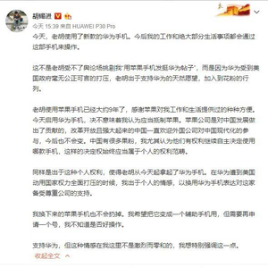 胡锡进表示:今天启用华为手机,决不意味着我认为应当抵制苹果。苹果公司是对中国发展做出了贡献的,改革开放且强大起来的中国一直欢迎外国公司对中国现代化的参与,今后也不会变。中国有很多果粉,我尤其认为他们有权利继续自主决定使用哪款手机,这样的决定权始终应当属于个人的权利范畴。