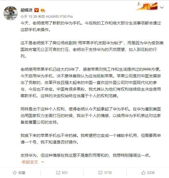 显然,胡锡进的一番“解释”不仅是为了表明自己对华为公司支持的态度,更是为了不得罪双方的粉丝。