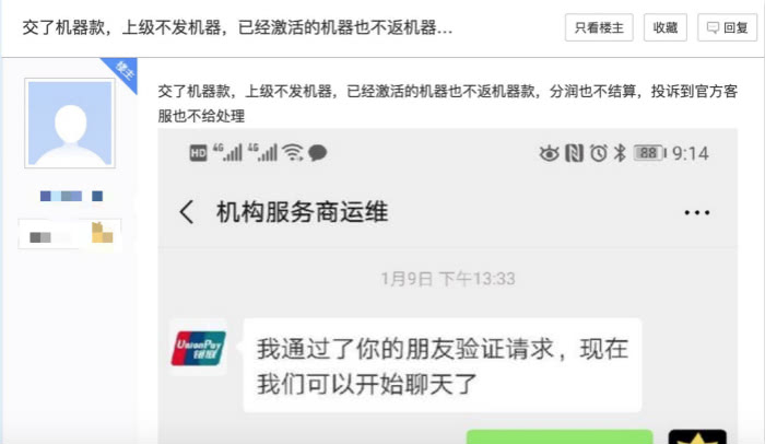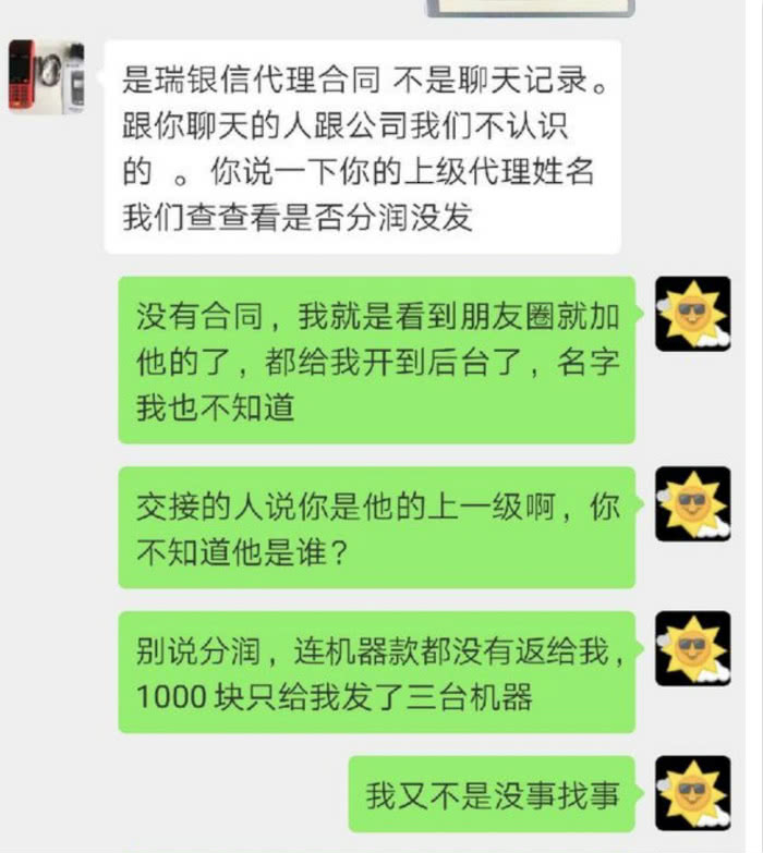 用户张先生(化名)在瑞银信百度贴吧发帖称,他在代理商处购买瑞银信旗下POS机产品,交款后收到机器数量少于实际付款购买的机器数量,多次联系对方无果,被对方删除微信好友。张先生辗转联系瑞银信其他客服,客服称并不认识卖机器给张先生的代理商,张先生向代理商购买机器时,代理商并没有出示代理合同。