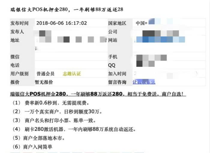这些代理商很大一部分通过网络完成销售,他们对外声称手里的POS机是拥有支付牌照的第三方支付企业的POS机产品。“瑞银信大POS机押金280,一年刷够88万返还280元,相当于免费送,商户自选!”这是许多瑞银信代理商所喊出的广告词。