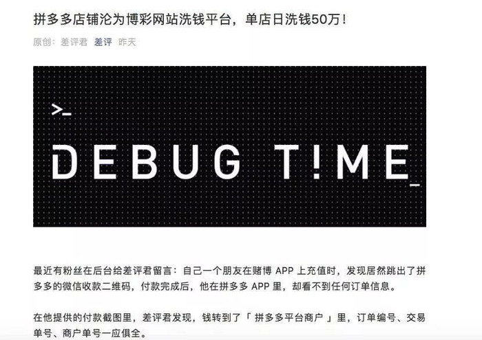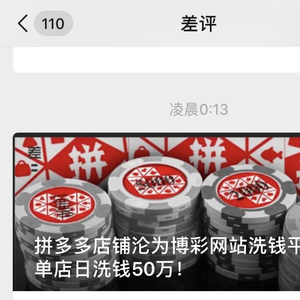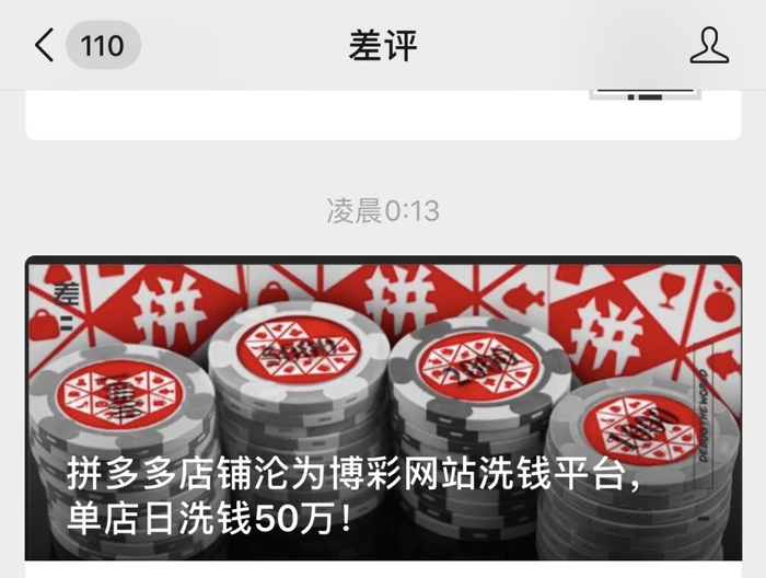 差评发布一条题为《拼多多店铺沦为博彩网站洗钱平台,单店日洗钱50万!》的资讯。文章强调,差评君经过多次不同商铺测试,可以确定,赌客的最终充值款项流入拼多多店家,成了合理、合法的店铺流水收入,为拼多多整个平台的大盘流水添砖加瓦。简言之,博彩网站的非法赌资经过拼多多这么一道,被洗白了。