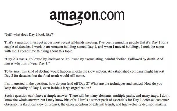 在信中,他详细解释了为什么这个心态对亚马逊依然重要——客户至上,拒绝代理,永远寻求为客户带来价值的手段。