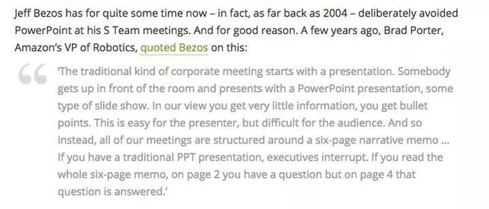这封贝佐斯的邮件正式取缔了 PPT 在亚马逊的使用,并强调了带着想法来开会的人必须以“组织得当的叙述体”呈现。