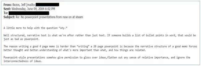 在那封现已众所周知的邮件里,他解释说,任何一位亚马逊团队成员都不允许把 PPT 甚至编号列表当成文档带进会场,所有想法都应该以密密麻麻的叙述备忘录的形式出现。