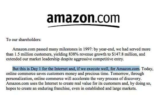 对于贝佐斯来说,“Day 1”令人回想起亚马逊创业伊始,那时候真的是互联网的“Day 1”。