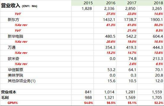 我们介绍了东方教育业务分为烹饪技术、汽车维修、及信息技术三大领域。旗下拥有五个知名学校品牌,新东方烹饪、欧米奇、新华电脑、万通汽车、及华信智原。