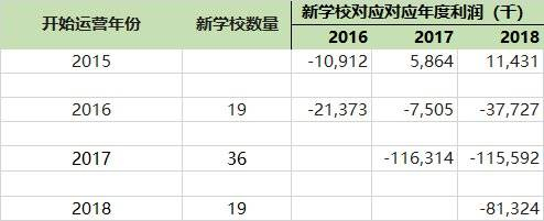 首先解释上图的含义,开始年份和新学校是指:在这一年新学校投入运营的个数,而利润则为当年新学校所产生的净利润。例如在2016年有19所学校运营使用,当年产生了2137万的净亏损,而这19所学校在2017年则亏损750万元,