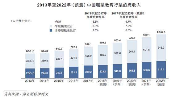 根据教育部的资料,由于培训人次及学费增加使中国职业教育行业从2013年的人民币6,016亿元稳步增至2017年的人民币7,681亿元,2013年至2017年的年复合增长率为6.3%,且预计于2022年将达到人民币10,623亿元,2017年至2022年(预测)的年复合增长率为6.7%。2017年非学历职业教育市场及学历职业教育市场分别为40.3%及59.7%。