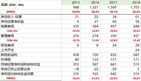 基于以上讨论的问题,东方教育的净利率连续三年下滑,2016-2018分别为24.2%、22.5%、15.6%,即便剔除掉上市开支的2400万,2018年的净利率为16.3%,