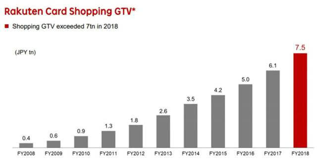 根据乐天公司提供的互联网服务,其旗下主要的利润来源是日本最大的电商网站运营商——乐天一霸,该公司在亚洲和欧洲有许多本地化的市场门户网站。它有着悠久的运营历史,在物流和支付方面是一个值得信赖的市场服务商。在其金融技术板块下是稳定的银行与信用卡服务。在这些领域,会员和交易价值呈逐年上升趋势,最近的交易额为7.5万亿日元。