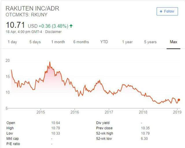 Rakuten Inc.的股价自2015年以来一直呈现3年下行趋势,并且仍然徘徊在3年低点。 按现在的10.71美元价格计算,乐天目前的估值为1.5倍,销售额和市盈率仅为12.3倍。相比之下,与之最接近的竞争对手亚马逊公司的估值为4倍,市盈率为历史收益的92倍。 乐天在信用卡业务上的另一个竞争对手是永旺金融服务有限公司(Aeon Financial Service Co Ltd),交易价格为1.4倍,市盈率为12.51。从长远来看,乐天拥有信用卡业务的坚实后盾和互联网业务的增长潜力,其估值水平与信用卡业务同行相当,且与互联网同行相比估值要求很低。五年期自由现金流年复合增长率高达25%。