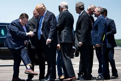 本月早些时候,特朗普访问路易斯安那州,当天该州副州长比利·农格瑟尔(Billy Nungesser)穿着整齐的西装迎接总统,在总统和新闻摄像机的见证下,农格塞尔高兴地抬起裤腿,露出了一双超级“硬核”的袜子。