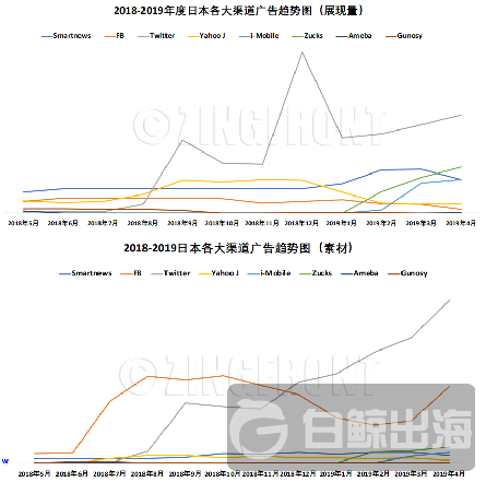下图为日本各大广告投放非常重要的两个图,如图所示广告呈现和投放素材数量称明显增势。从推广角度,Twitter、Smartnews、Zucks、iMobile 是日本游戏推广是最主流的渠道,同时 Facebook 和Twitter 要明显高于其他渠道。