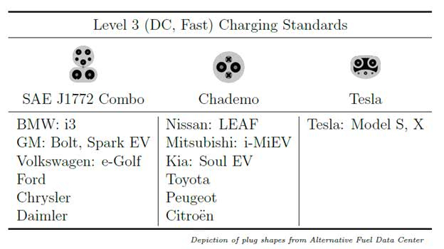 目前,所有汽车公司投资的 Level 1 和 Level 2 的充电站共享统一标准,但在 Level 3 的类型下,根据却形成三种互不兼容的充电标准。