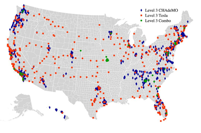 根据替代燃料数据中心(AFDC)车站定位器,截止2019年6月4日,美国共有 696 个特斯拉超级充电桩,2449 个 Chademo 标准的充电站,以及 2194 个CCS标准充电站。