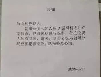 然而万万没想到的是,4年后,他创办的网利宝已被北京朝阳经侦立案侦查。“朝阳经侦已对A座7层网利(宝)进行立案侦查,已对现场进行保留,投资人如有问题,请去北京市公安局朝阳分局经济犯罪侦查大队报警及咨询。”