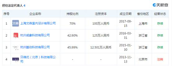 不过最新资料显示,韩冰随后再创业,且跨行业:包括2017年9月创办文森室内设计公司,以做建筑装饰建设工程专项设计为主;2016年创办为威象科技,以电子产品、监控设备的技术开发、技术服务为主业。