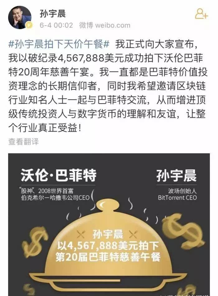 6月4日凌晨,孙宇晨在个人微博上宣布,成为第二十届“巴菲特慈善午餐”的最终竞拍赢家,以创记录高价456.7888万美元(约折合人民币3154万元)拍下“巴菲特慈善午餐”,孙宇晨也将成为全球首个与巴菲特共进午餐的90后币圈CEO。