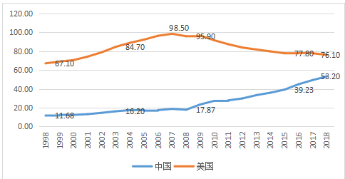 图1 近20年中美居民杠杆率的变化趋势 数据来源:wind
