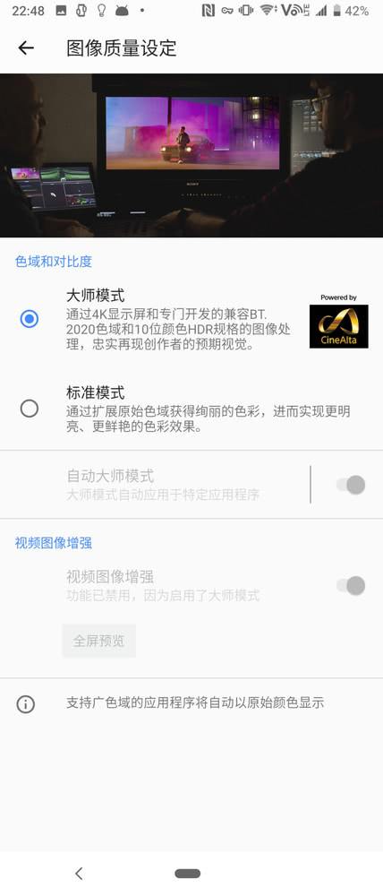 此次索尼Xperia 1的屏幕新增了“大师模式”。如果你是一个电影爱好者,这个“大师模式”就是专为你设计的。因为在该模式下看电影时,它的色彩更接近创作者的预期视觉效果,如果我们有合适的片源,在索尼Xperia 1上观看时会获得一个色彩真实的画面。尤其是当我打开内置的《蜘蛛侠:英雄远征》预告片时,那种完美的色彩,让我反反复复看了十几遍的预告片。