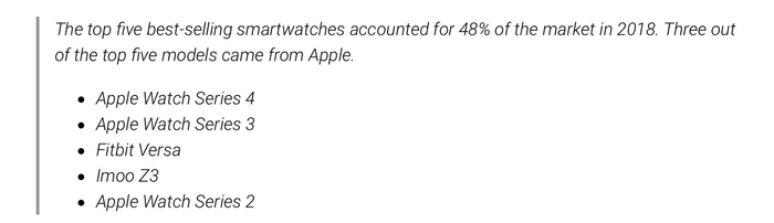 除了第四代手表,Apple Watch Series 3则是2018年第二畅销的智能手表,而Apple Watch Series 2排在第五。第三、第四分别是Fitbit Versa和Imoo Z3。前五名里,Apple Watch占了三席,市场占有率可见一斑。