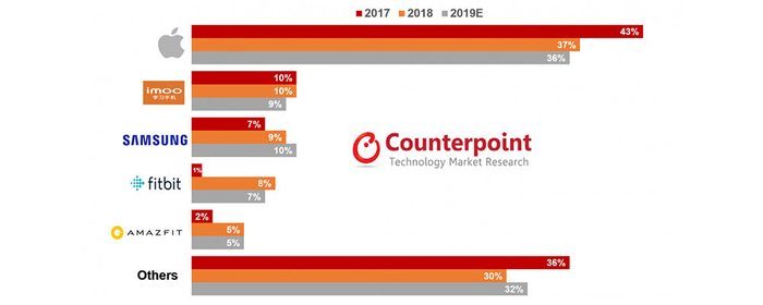 在智能手表市场中,Apple Watch有着绝对的优势,其实放眼到这个腕上可穿戴设备市场,Apple Watch依旧榜上有名。在近日,Counterpoint Research统计机构公布的2018年到2019年初智能手表市场数据也印证了上述观点。